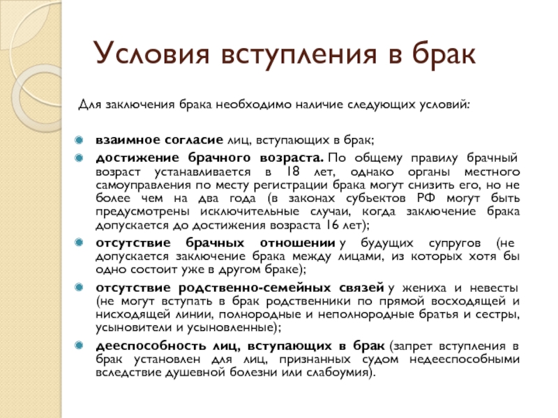отсутствие брачных отношении у будущих супругов (не допускается заключение брака между лицами, из которых хотя бы одно состоит уже в другом браке);