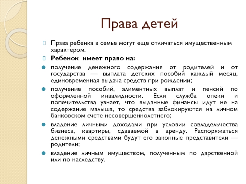 Права ребенка в семье могут еще отличаться имущественным характером.