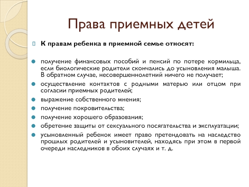усыновленный ребенок имеет право претендовать на наследство прошлых родителей и усыновителей, находясь при этом в первой очереди наследников в обоих случаях и т. д.