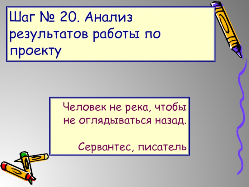 Слайд 49Шаг № 20. Анализ результатов работы по проекту