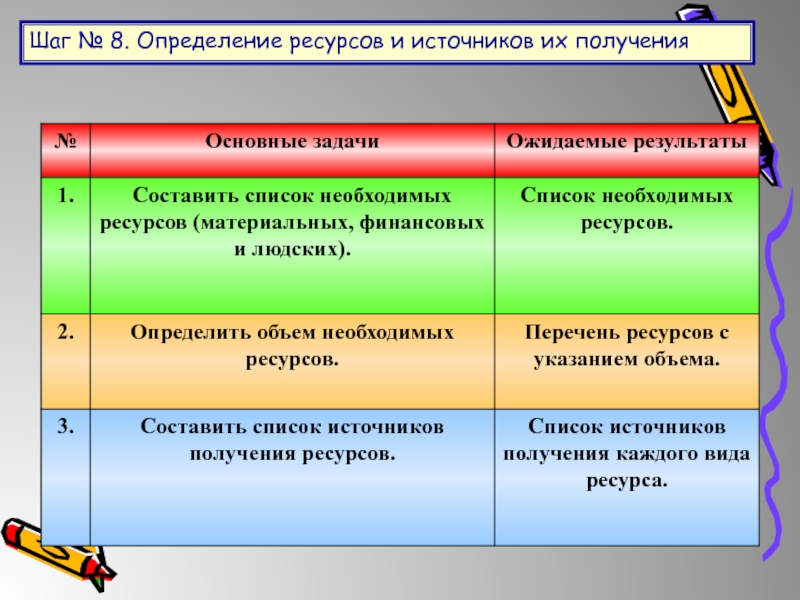 Слайд 33Шаг № 8. Определение ресурсов и источников их получения