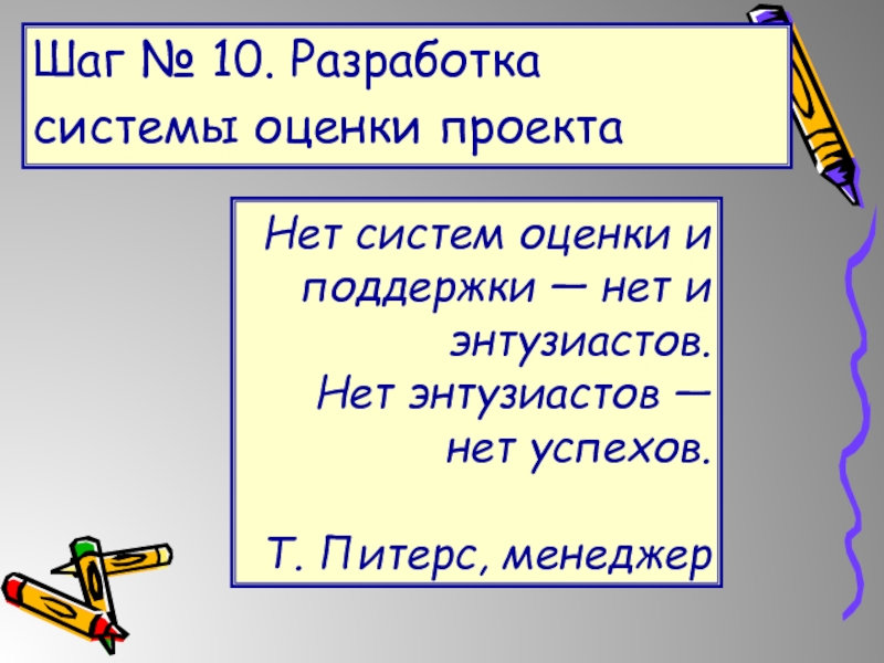 Слайд 36Шаг № 10. Разработка системы оценки проекта