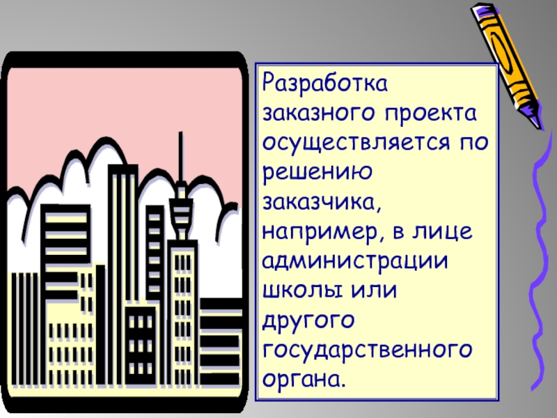 Слайд 10Разработка заказного проекта осуществляется по решению заказчика, например, в лице