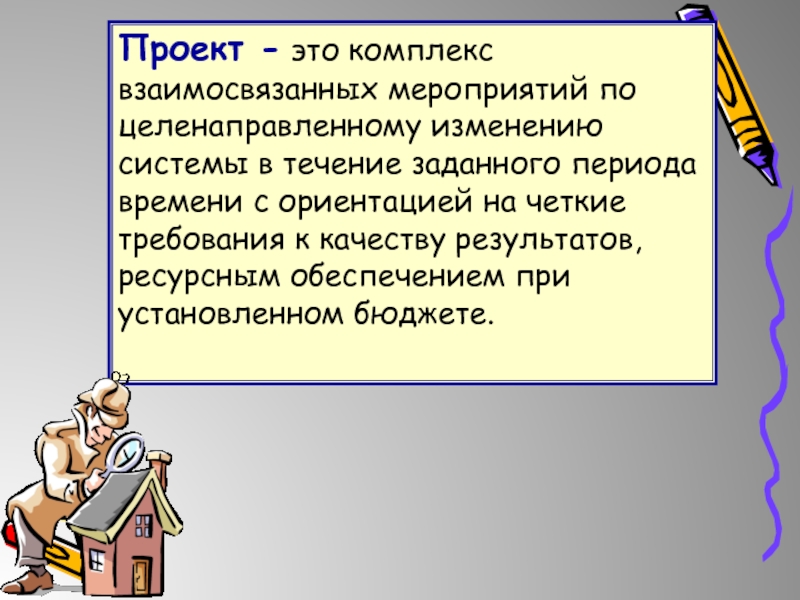 Слайд 6Проект - это комплекс взаимосвязанных мероприятий по целенаправленному изменению системы
