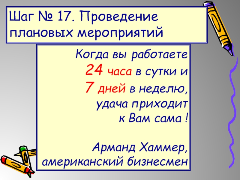 Слайд 45Шаг № 17. Проведение плановых мероприятий
