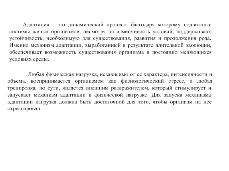стресс, а любая тренировка, по сути, является внешним раздражителем, который стимулирует и запускает механизм адаптации к физической нагрузке. Для запуска механизма адаптации нагрузка должна быть достаточной для того, чтобы организм на нее отреагировал