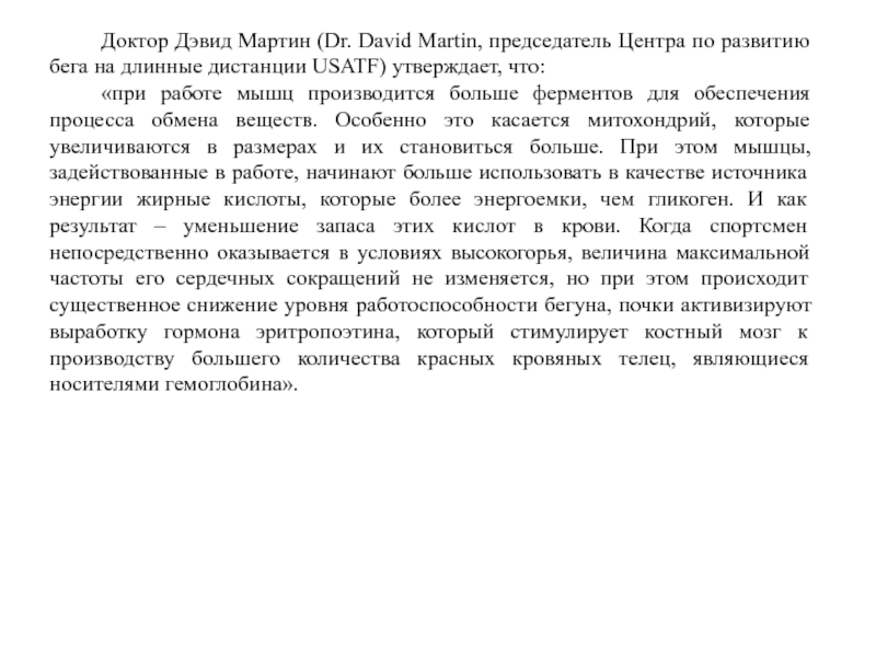 производится больше ферментов для обеспечения процесса обмена веществ. Особенно это касается митохондрий, которые увеличиваются в размерах и их становиться больше. При этом мышцы, задействованные в работе, начинают больше использовать в качестве источника энергии жирные кислоты, которые более энергоемки, чем гликоген. И как результат – уменьшение запаса этих кислот в крови. Когда спортсмен непосредственно оказывается в условиях высокогорья, величина максимальной частоты его сердечных сокращений не изменяется, но при этом происходит существенное снижение уровня работоспособности бегуна, почки активизируют выработку гормона эритропоэтина, который стимулирует костный мозг к производству большего количества красных кровяных телец, являющиеся носителями гемоглобина».