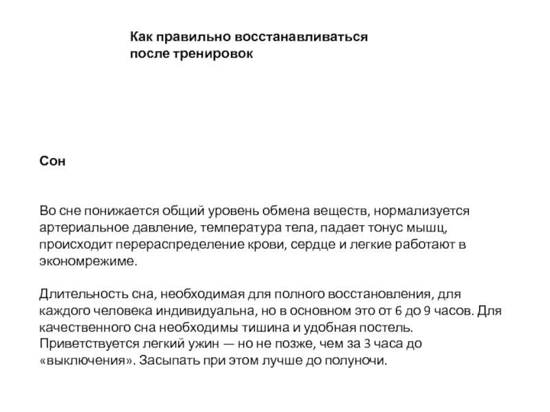 Длительность сна, необходимая для полного восстановления, для каждого человека индивидуальна, но в основном это от 6 до 9 часов. Для качественного сна необходимы тишина и удобная постель. Приветствуется легкий ужин — но не позже, чем за 3 часа до «выключения». Засыпать при этом лучше до полуночи.