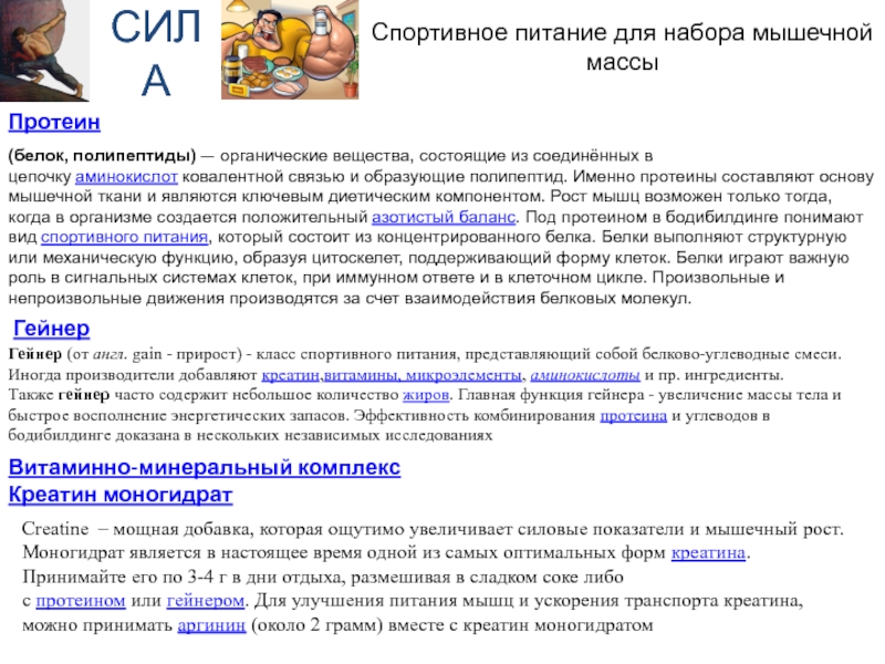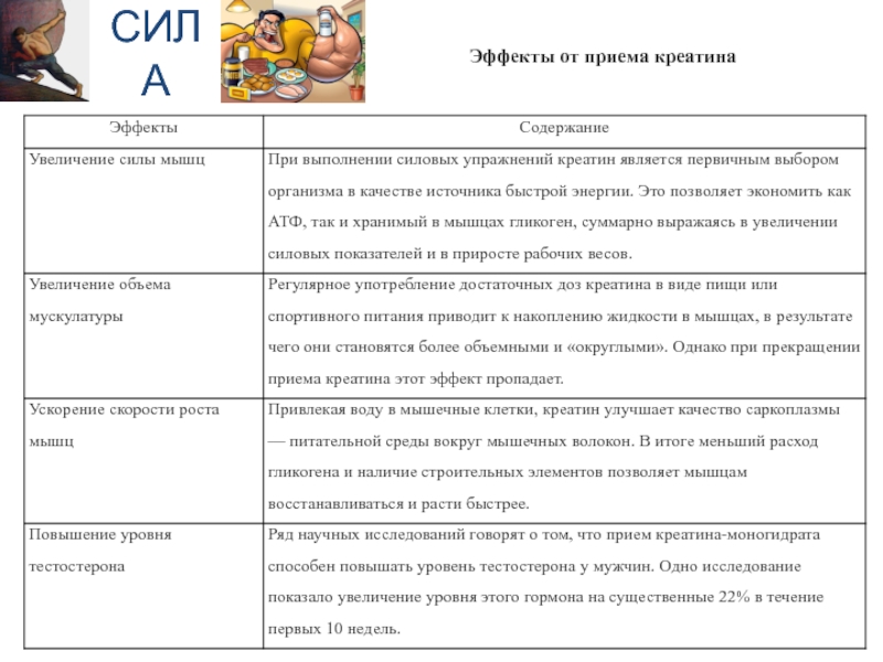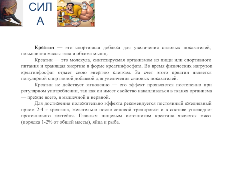 организмом из пищи или спортивного питания и хранящая энергию в форме креатинфосфата. Во время физических нагрузок креатинфосфат отдает свою энергию клеткам. За счет этого креатин является популярной спортивной добавкой для увеличения силовых показателей.