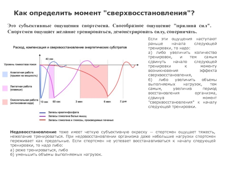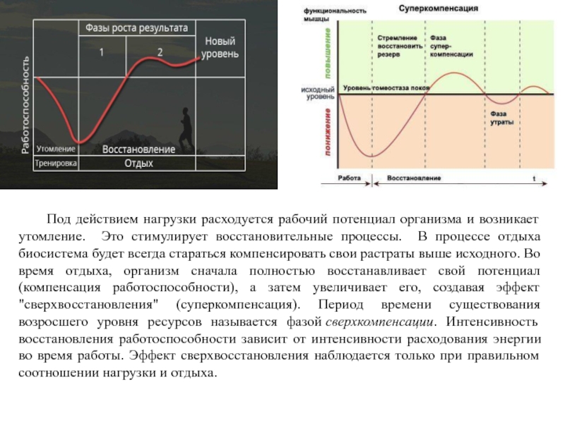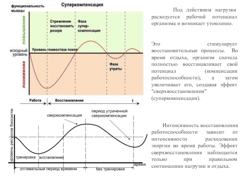 стараться компенсировать свои растраты выше исходного. Во время отдыха, организм сначала полностью восстанавливает свой потенциал (компенсация работоспособности), а затем увеличивает его, создавая эффект "сверхвосстановления" (суперкомпенсация). Период времени существования возросшего уровня ресурсов называется фазой сверхкомпенсации. Интенсивность восстановления работоспособности зависит от интенсивности расходования энергии во время работы. Эффект сверхвосстановления наблюдается только при правильном соотношении нагрузки и отдыха.