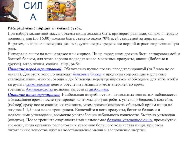 Питание перед тренировкой. Обязательно нужно поесть перед тренировкой (за 2 часа до ее начала). Для этого хорошо подходят белковые блюда и продукты содержащие медленные углеводы: каши, мучное, овощи и др. Углеводы перед тренировкой необходимы для того, чтобы загрузить гликогеновые депо и обеспечить мышцы и мозг энергией во время тренинга. Аминокислоты позволят запустить анаболизм.