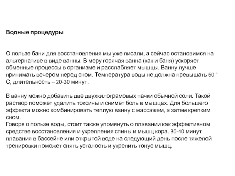 ванна (как и баня) ускоряет обменные процессы в организме и расслабляет мышцы. Ванну лучше принимать вечером перед сном. Температура воды не должна превышать 60 °С, длительность – 20-30 минут.