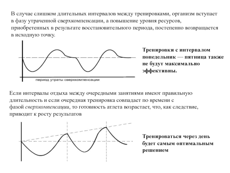 Слайд 15В случае слишком длительных интервалов между тренировками, организм вступает в