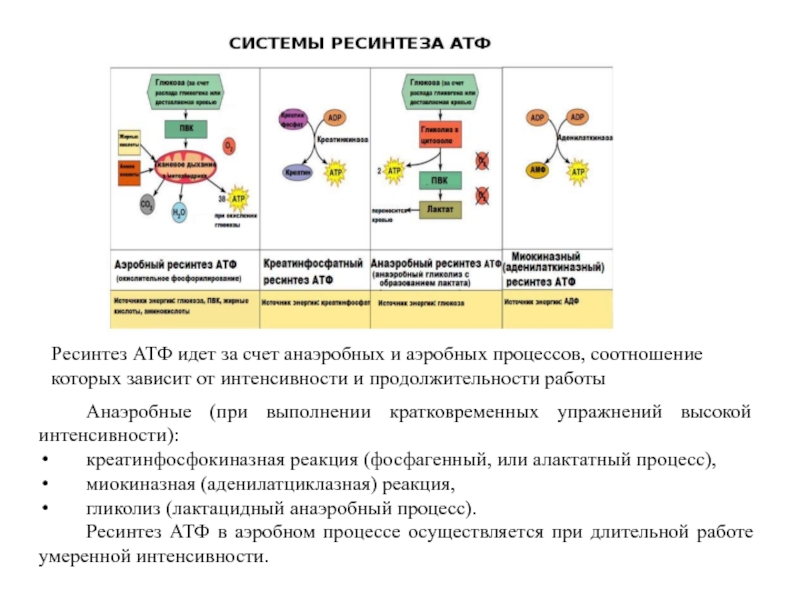 Слайд 10Ресинтез АТФ идет за счет анаэробных и аэробных процессов, соотношение