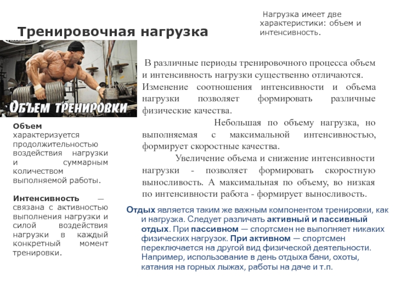 это два составных элемента тренировки, с помощью которых формируется и тренированность спортсмена, и все его физические качества (сила, выносливость, скорость и др.).