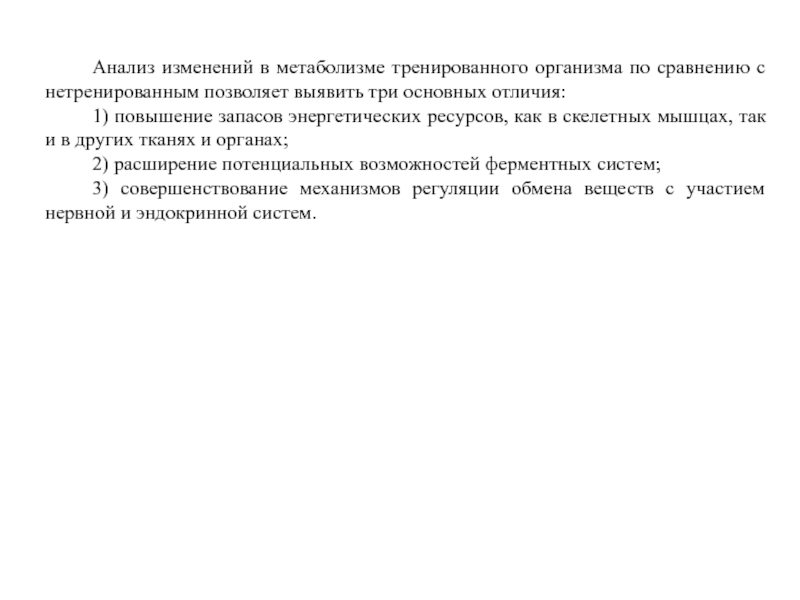 Слайд 7Анализ изменений в метаболизме тренированного организма по сравнению с нетренированным