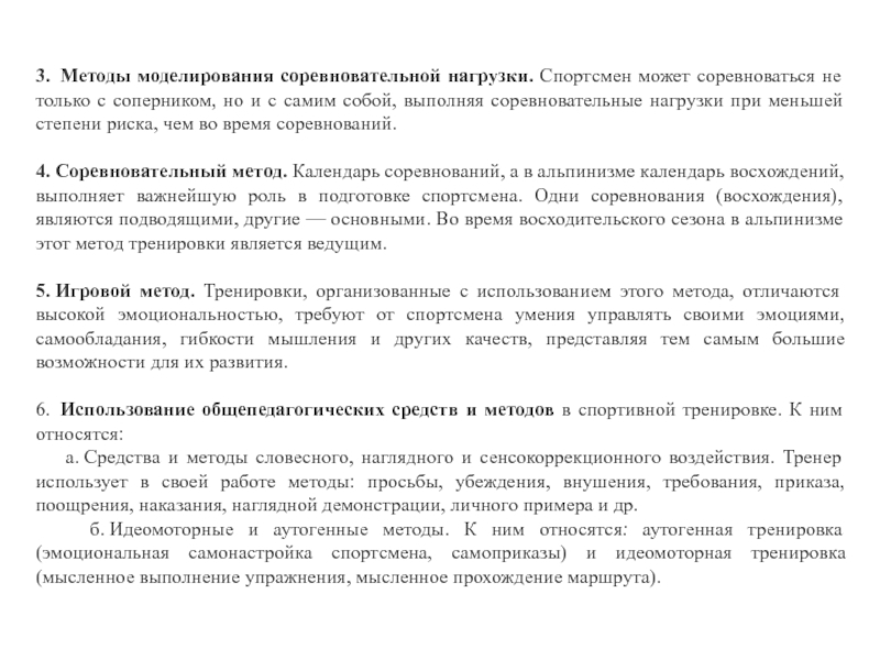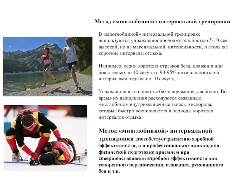 4) упражнения в преодолении сопротивления внешней среды эффективны при тренировке в ускоренном передвижении и силовой выносливости (например, бег в гору или по песку, cнегу, воде, против ветра и т. п.), для специальной силовой подготовки к рукопашному бою (на льду, песке, в воде и т. п.).