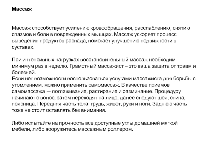 поврежденных мышцах. Массаж ускоряет процесс выведения продуктов распада, помогает улучшению
