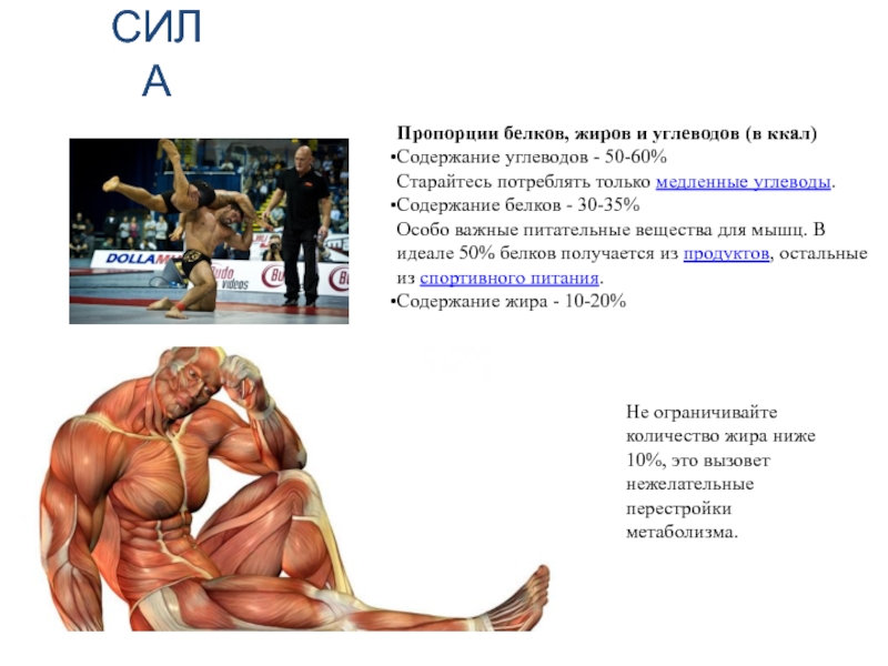 Не ограничивайте количество жира ниже 10%, это вызовет нежелательные перестройки метаболизма.
