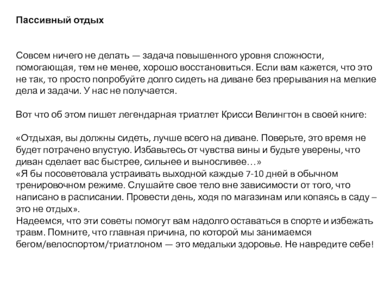 Вот что об этом пишет легендарная триатлет Крисси Велингтон в своей книге: