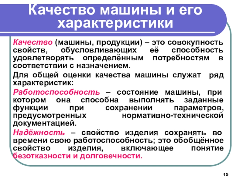 Работоспособность – состояние машины, при котором она способна выполнять заданные функции при сохранении параметров, предусмотренных нормативно-технической документацией.