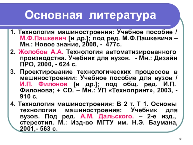 2. Жолобов А.А. Технология автоматизированного производства. Учебник для вузов. - Мн.: Дизайн ПРО, 2000, - 624 с.