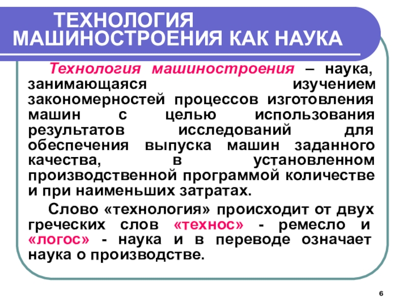 Слайд 6 ТЕХНОЛОГИЯ МАШИНОСТРОЕНИЯ КАК НАУКА