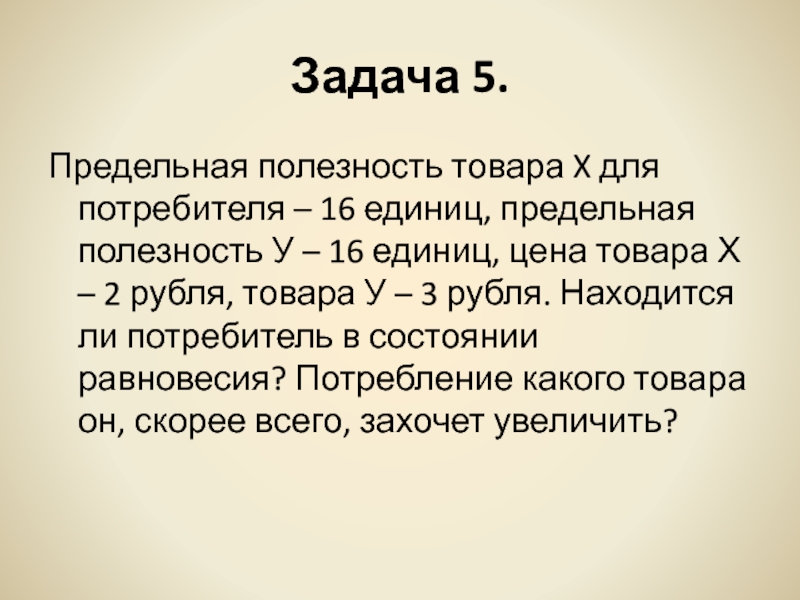 – 2 рубля, товара У – 3 рубля. Находится ли потребитель в состоянии равновесия? Потребление какого товара он, скорее всего, захочет увеличить?