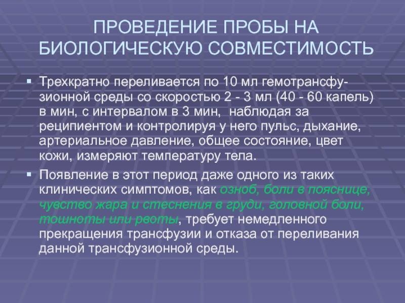 Слайд 14ПРОВЕДЕНИЕ ПРОБЫ НА ИНДИВИДУАЛЬНУЮ СОВМЕСТИМОСТЬ