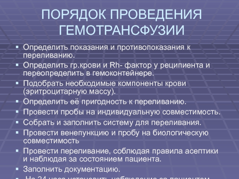 Провести переливание, соблюдая правила асептики и наблюдая за состоянием пациента.