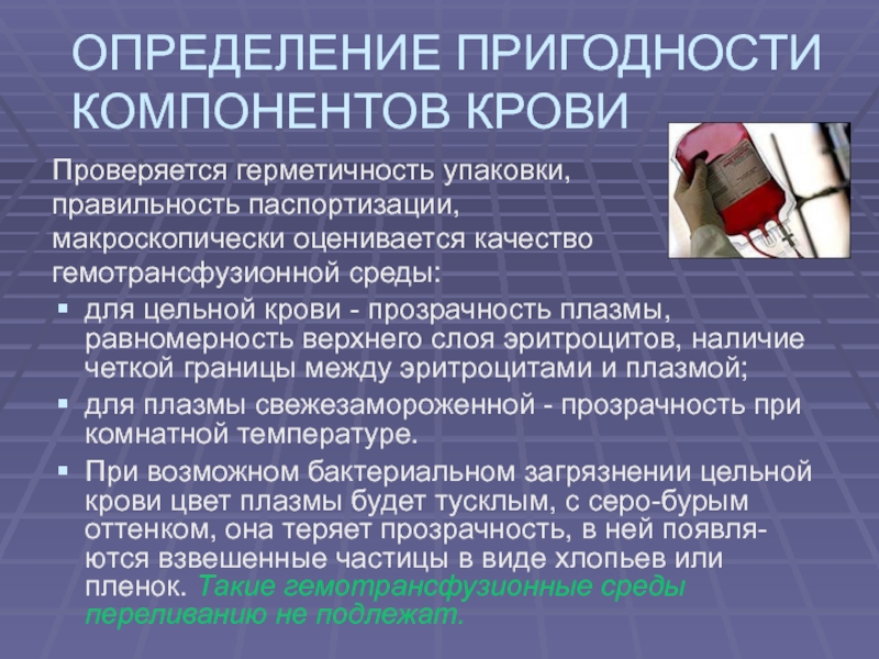 При возможном бактериальном загрязнении цельной крови цвет плазмы будет тусклым, с серо-бурым оттенком, она теряет прозрачность, в ней появля-ются взвешенные частицы в виде хлопьев или пленок. Такие гемотрансфузионные среды переливанию не подлежат.