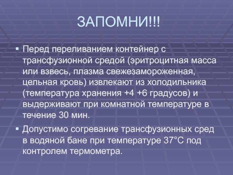 Допустимо согревание трансфузионных сред в водяной бане при температуре 37°С под контролем термометра.