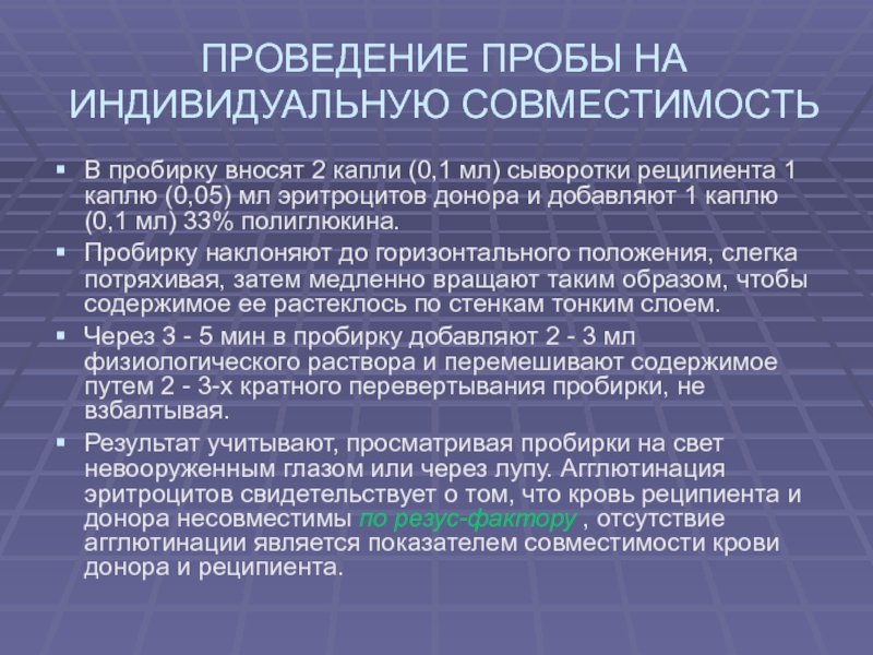 Слайд 15ПРОВЕДЕНИЕ ПРОБЫ НА ИНДИВИДУАЛЬНУЮ СОВМЕСТИМОСТЬ