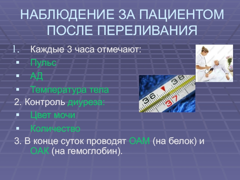 Слайд 17НАБЛЮДЕНИЕ ЗА ПАЦИЕНТОМ ПОСЛЕ ПЕРЕЛИВАНИЯ