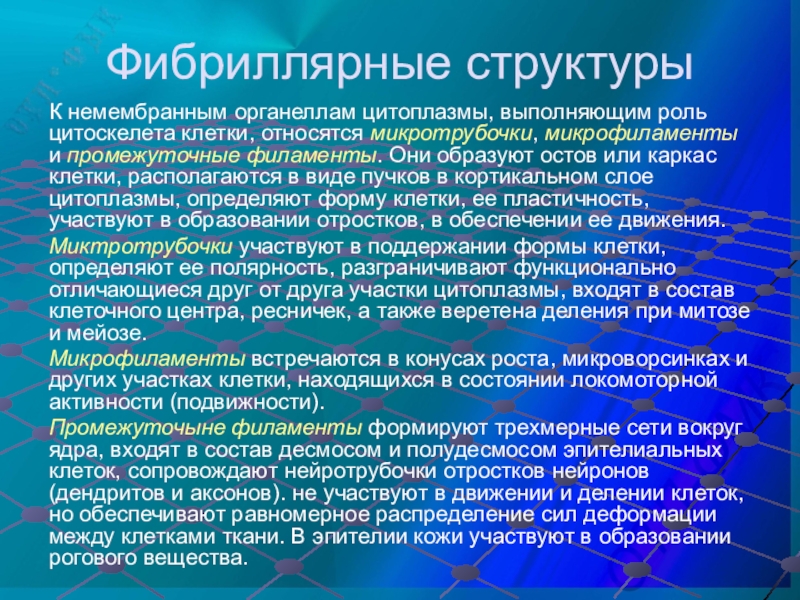 клетки, располагаются в виде пучков в кортикальном слое цитоплазмы, определяют форму клетки, ее пластичность, участвуют в образовании отростков, в обеспечении ее движения.