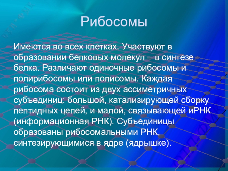 в синтезе белка. Различают одиночные рибосомы и полирибосомы или полисомы.