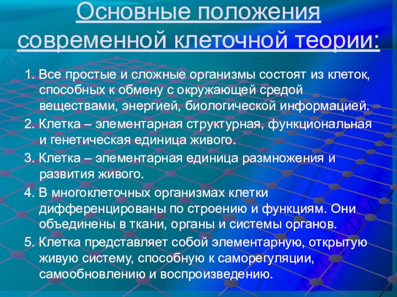 5. Клетка представляет собой элементарную, открытую живую систему, способную к саморегуляции, самообновлению и воспроизведению.