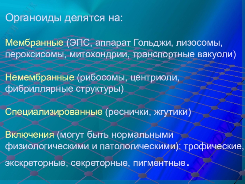 Мембранные (ЭПС, аппарат Гольджи, лизосомы, пероксисомы, митохондрии, транспортные
