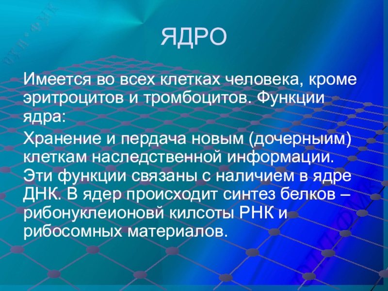 связаны с наличием в ядре ДНК. В ядер происходит синтез белков – рибонуклеионовй килсоты РНК и рибосомных материалов.