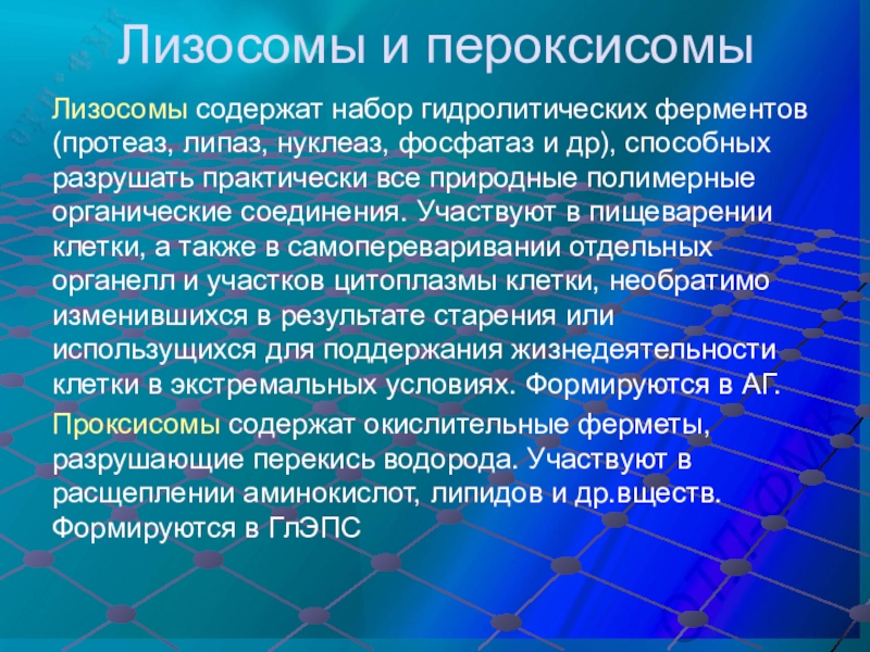 соединения. Участвуют в пищеварении клетки, а также в самопереваривании отдельных органелл и участков цитоплазмы клетки, необратимо изменившихся в результате старения или использущихся для поддержания жизнедеятельности клетки в экстремальных условиях. Формируются в АГ.