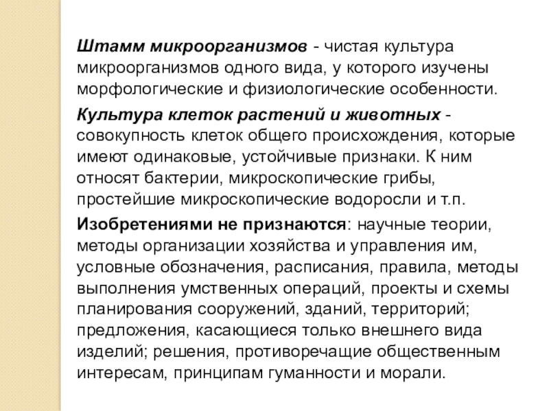 Изобретениями не признаются: научные теории, методы организации хозяйства и управления им, условные обозначения, расписания, правила, методы выполнения умственных операций, проекты и схемы планирования сооружений, зданий, территорий; предложения, касающиеся только внешнего вида изделий; решения, противоречащие общественным интересам, принципам гуманности и морали.