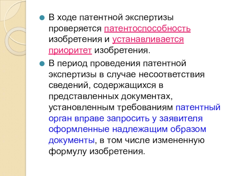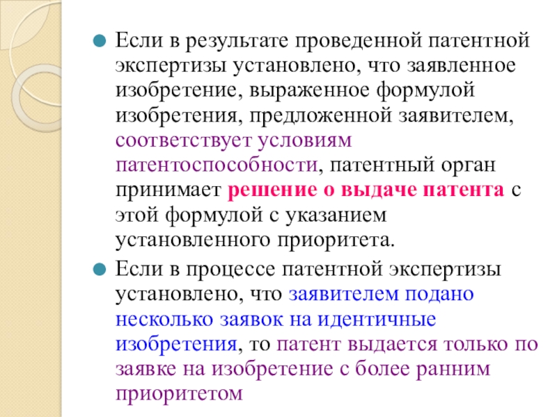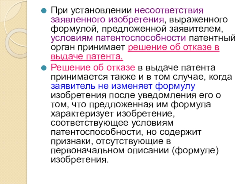 Слайд 38При установлении несоответствия заявленного изобретения, выраженного формулой, предложенной заявителем, условиям