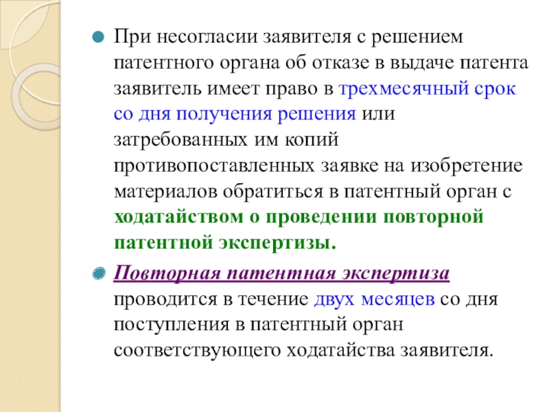 Повторная патентная экспертиза проводится в течение двух месяцев со дня поступления в патентный орган соответствующего ходатайства заявителя.
