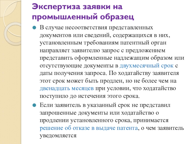 запрос с предложением представить оформленные надлежащим образом или отсутствующие документы в двухмесячный срок с даты получения запроса. По ходатайству заявителя этот срок может быть продлен, но не более чем на двенадцать месяцев при условии, что ходатайство поступило до истечения этого срока.