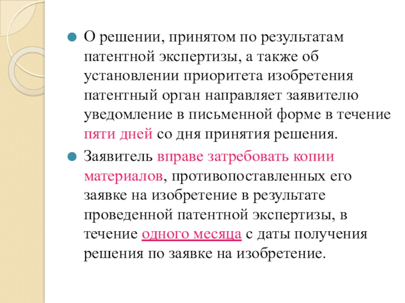 Слайд 39О решении, принятом по результатам патентной экспертизы, а также об