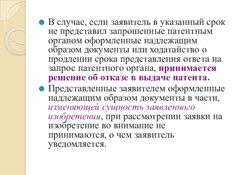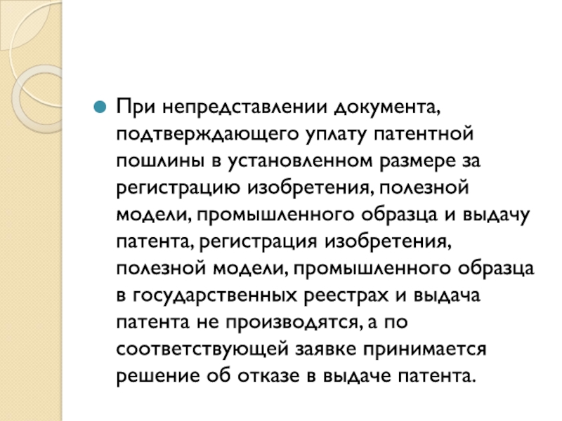 Слайд 50При непредставлении документа, подтверждающего уплату патентной пошлины в установленном размере