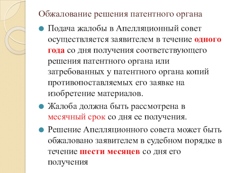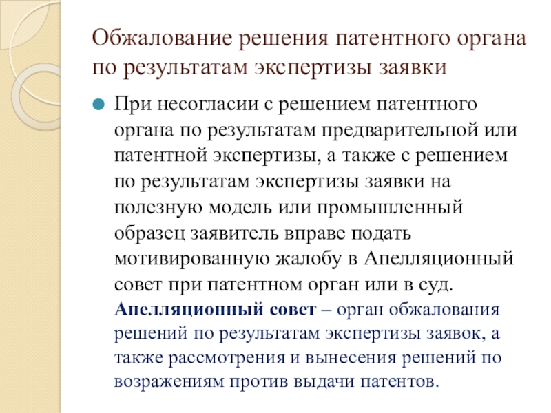 Слайд 47Обжалование решения патентного органа по результатам экспертизы заявки