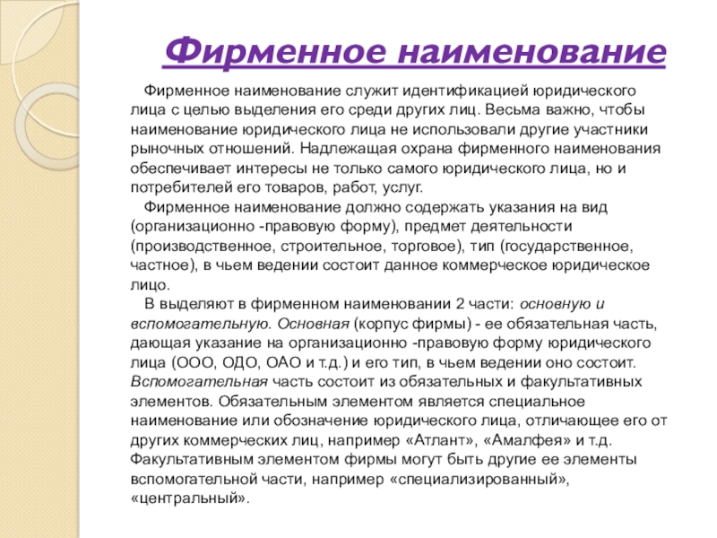 В выделяют в фирменном наименовании 2 части: основную и вспомогательную. Основная (корпус фирмы) - ее обязательная часть, дающая указание на организационно -правовую форму юридического лица (ООО, ОДО, ОАО и т.д.) и его тип, в чьем ведении оно состоит. Вспомогательная часть состоит из обязательных и факультативных элементов. Обязательным элементом является специальное наименование или обозначение юридического лица, отличающее его от других коммерческих лиц, например «Атлант», «Амалфея» и т.д. Факультативным элементом фирмы могут быть другие ее элементы вспомогательной части, например «специализированный», «центральный».