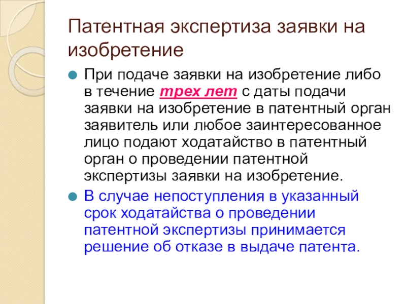патентоспособности патентный орган принимает решение об отказе в выдаче патента.