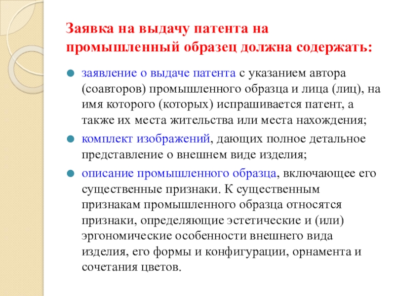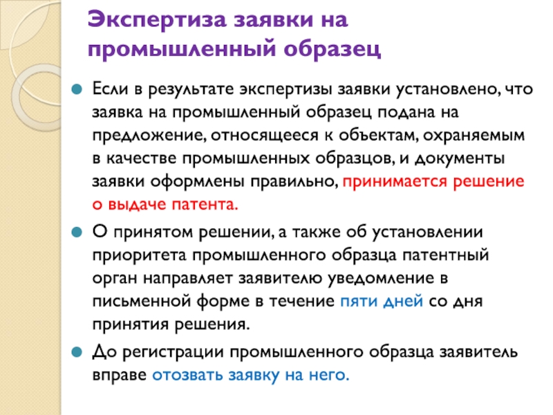 объектам, охраняемым в качестве промышленных образцов, и документы заявки оформлены правильно, принимается решение о выдаче патента.